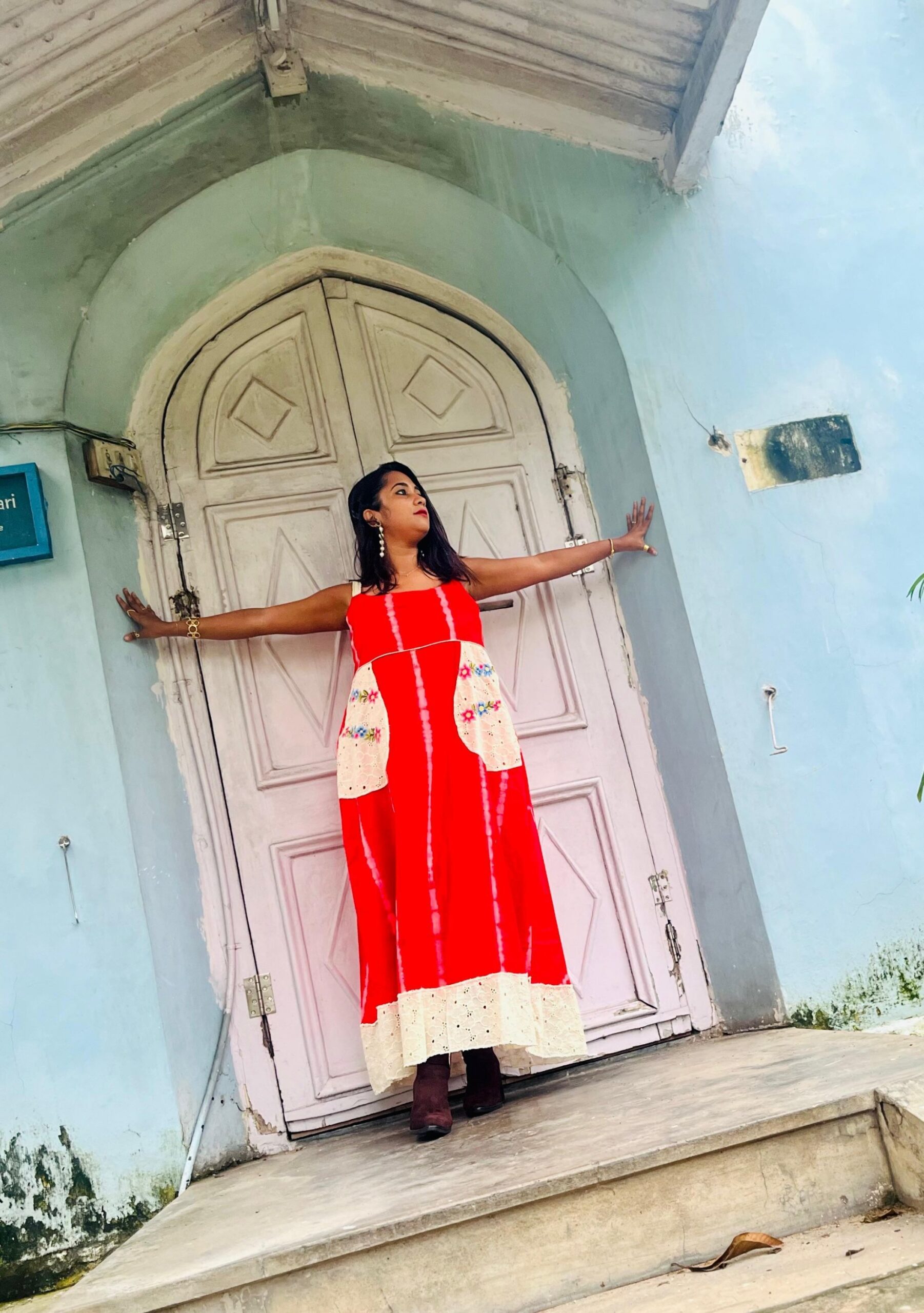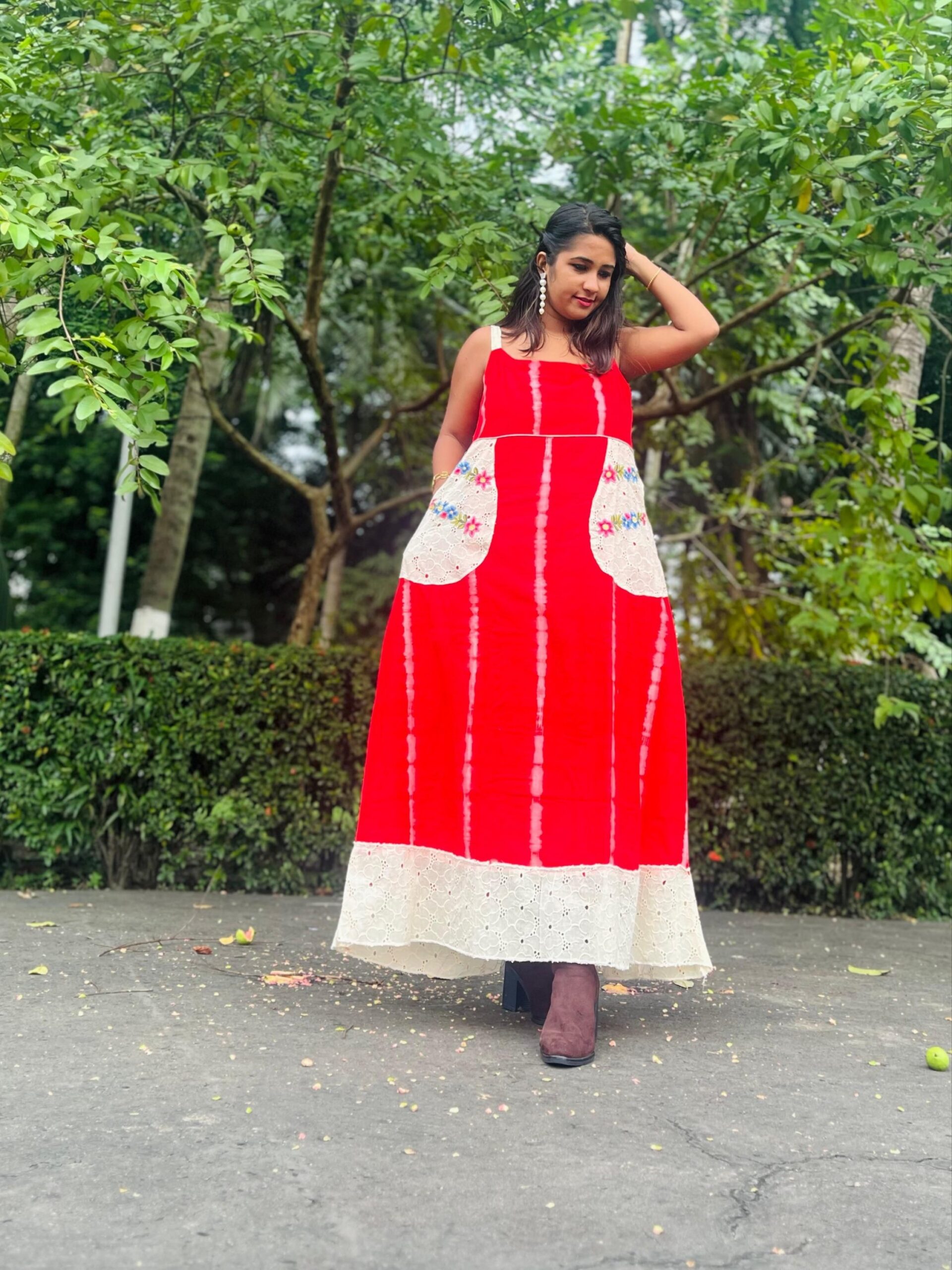 RED LAHERIYA CHIKON EMBROIDERY POCKET DRESS